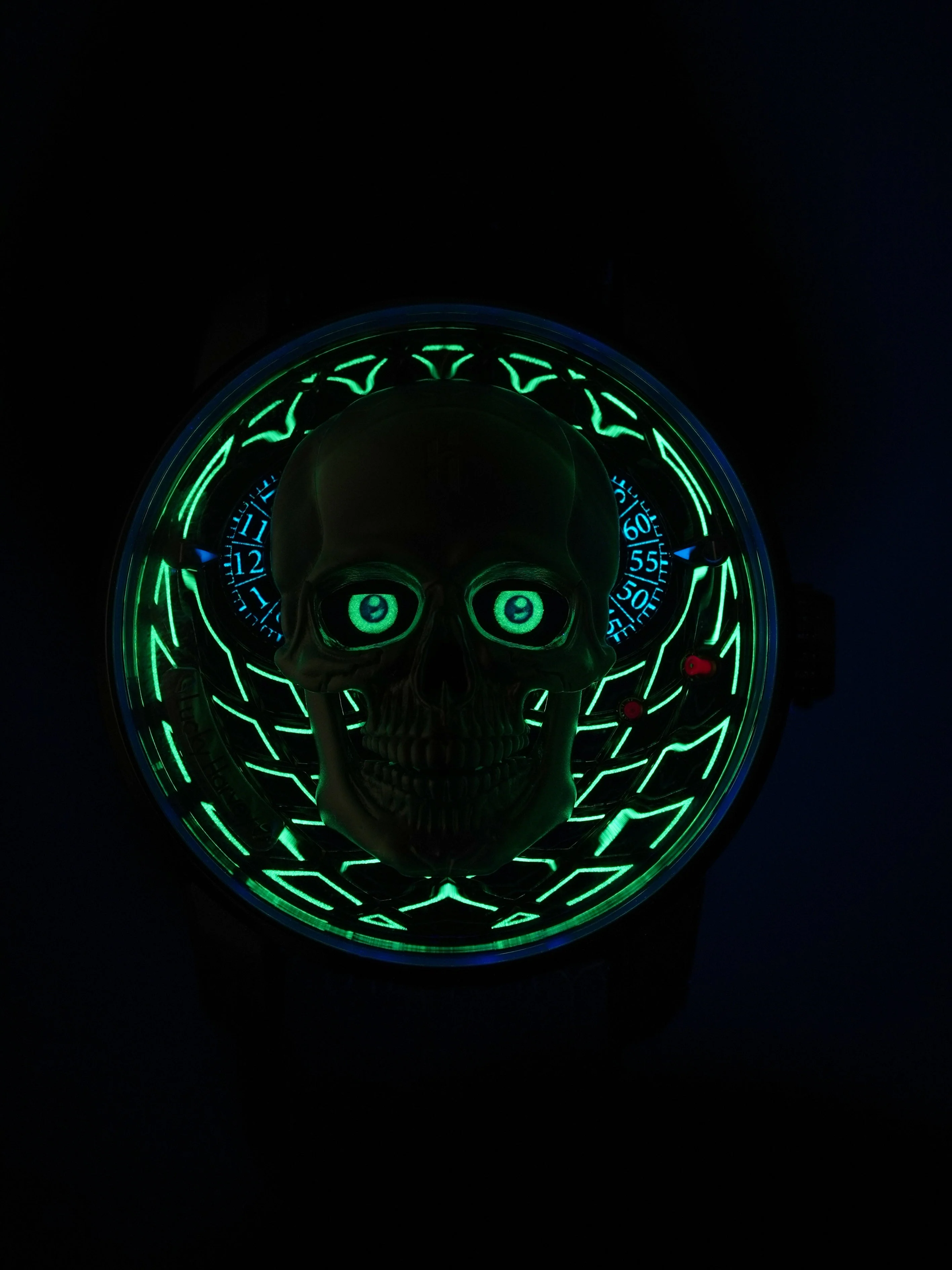 The centerpiece is a 925 pure silver skull, meticulously handcrafted and hand-painted to perfection. The design features a captivating mechanism where the left eye displays the hour, the right eye shows the minute, and the skull’s jaw at 6 o’clock gracefully moves at each hour. Additionally, the eyes subtly open and close, adding a dramatic, mesmerizing touch. This watch is a true masterpiece, blending artisanal craftsmanship with bold, avant-garde design.
